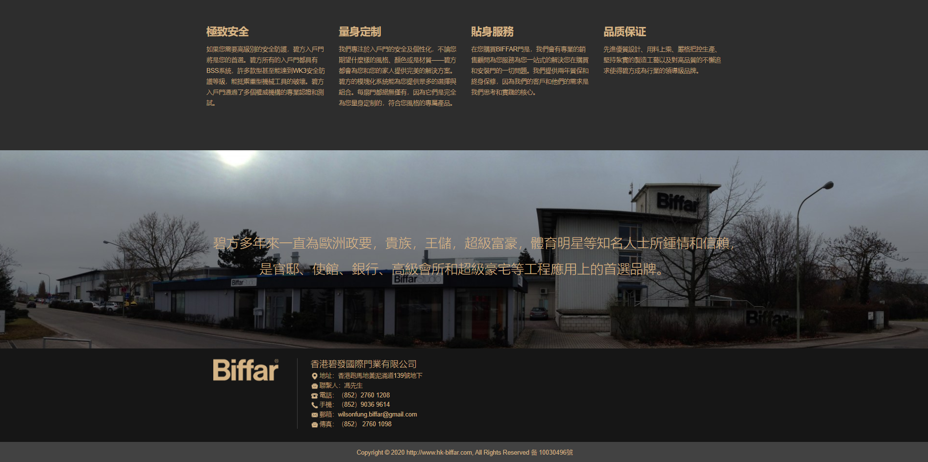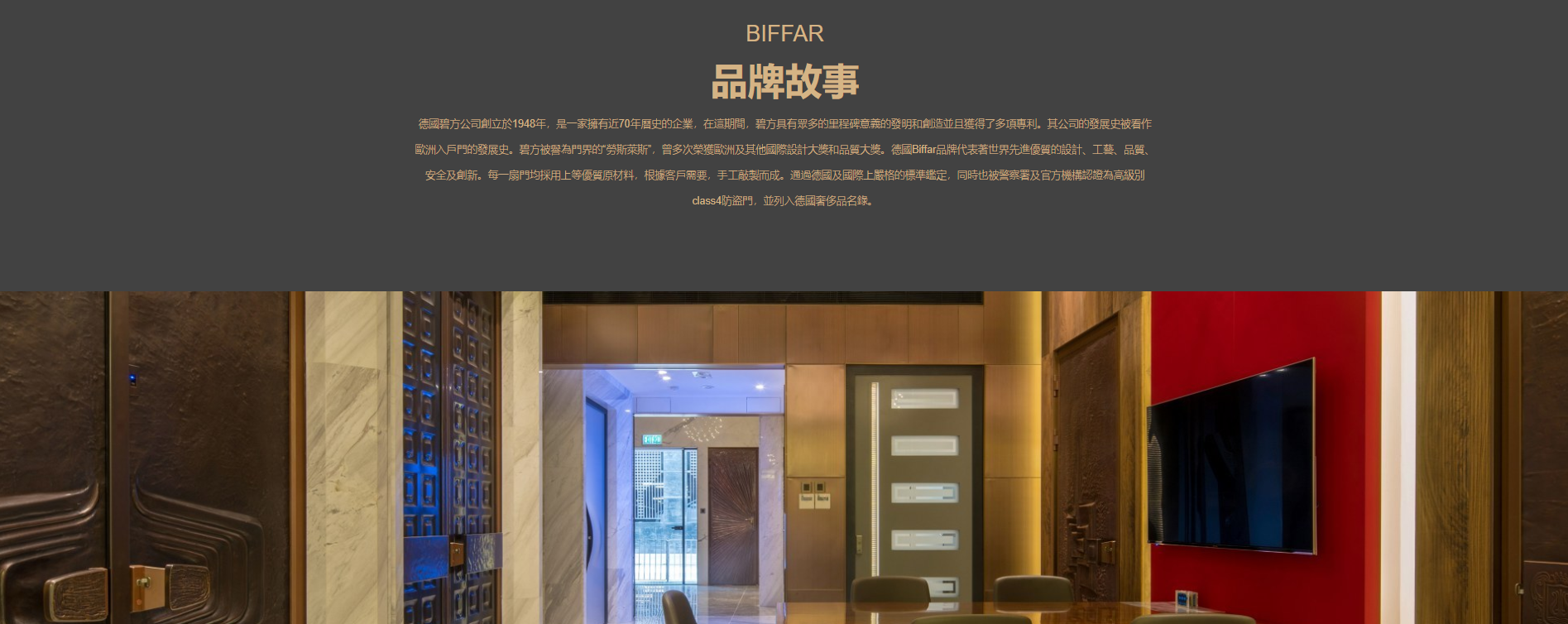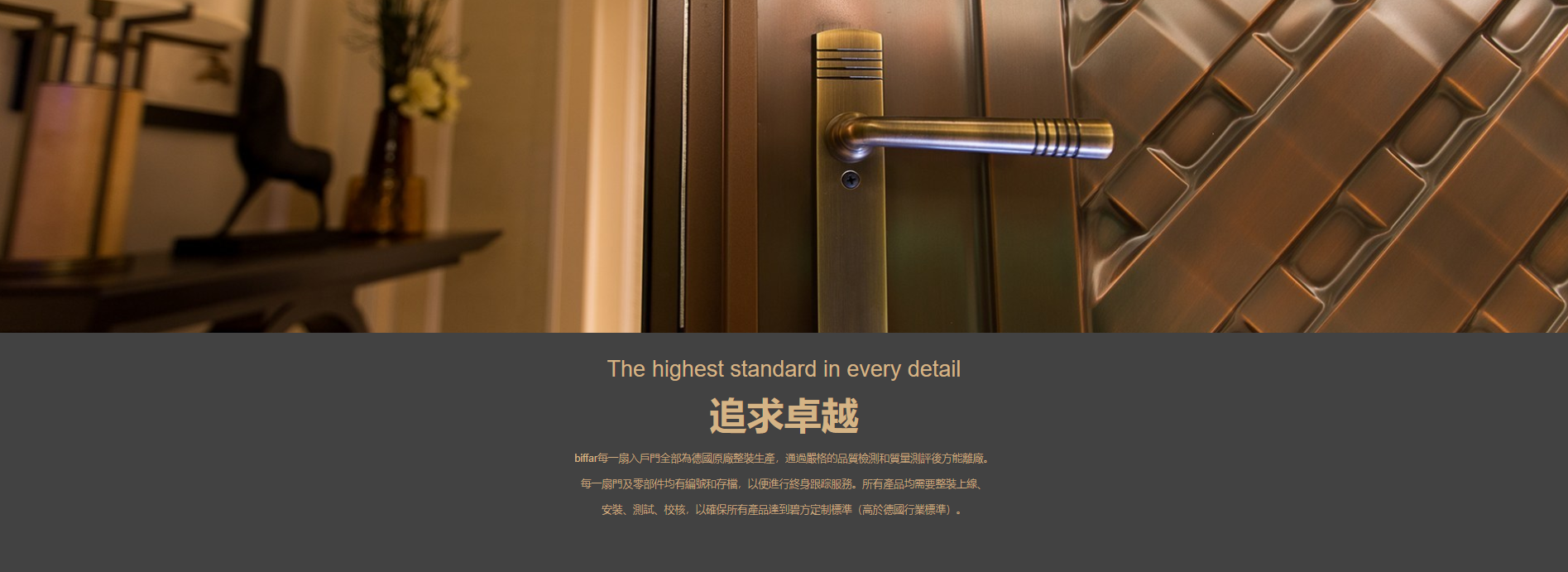 深圳碧發(fā)商貿(mào)有限公司是經(jīng)德國Biffar集團(Biffar GmbH & Co.KG)官方授權(quán)的專業(yè)代理商。有權(quán)在中國及港、澳地區(qū)銷售德國Biffar集團產(chǎn)品。 Biffar產(chǎn)品為行業(yè)的翹楚,為政要、貴族、王儲、超級富豪、體育明星等頂級人士所鍾情和信賴,同時也贏得政府、企業(yè)及地產(chǎn)開發(fā)商的青睞,多次應(yīng)用在使館、官邸、銀行、頂級會所標(biāo)誌性建築及超級豪宅等工程上。Biffar入戶門的發(fā)展歷史也是德國乃至歐洲入戶門發(fā)展的歷史,同時也開創(chuàng)了德國安全入戶門的標(biāo)準(zhǔn),始終為行業(yè)的開創(chuàng)者及領(lǐng)導(dǎo)者。